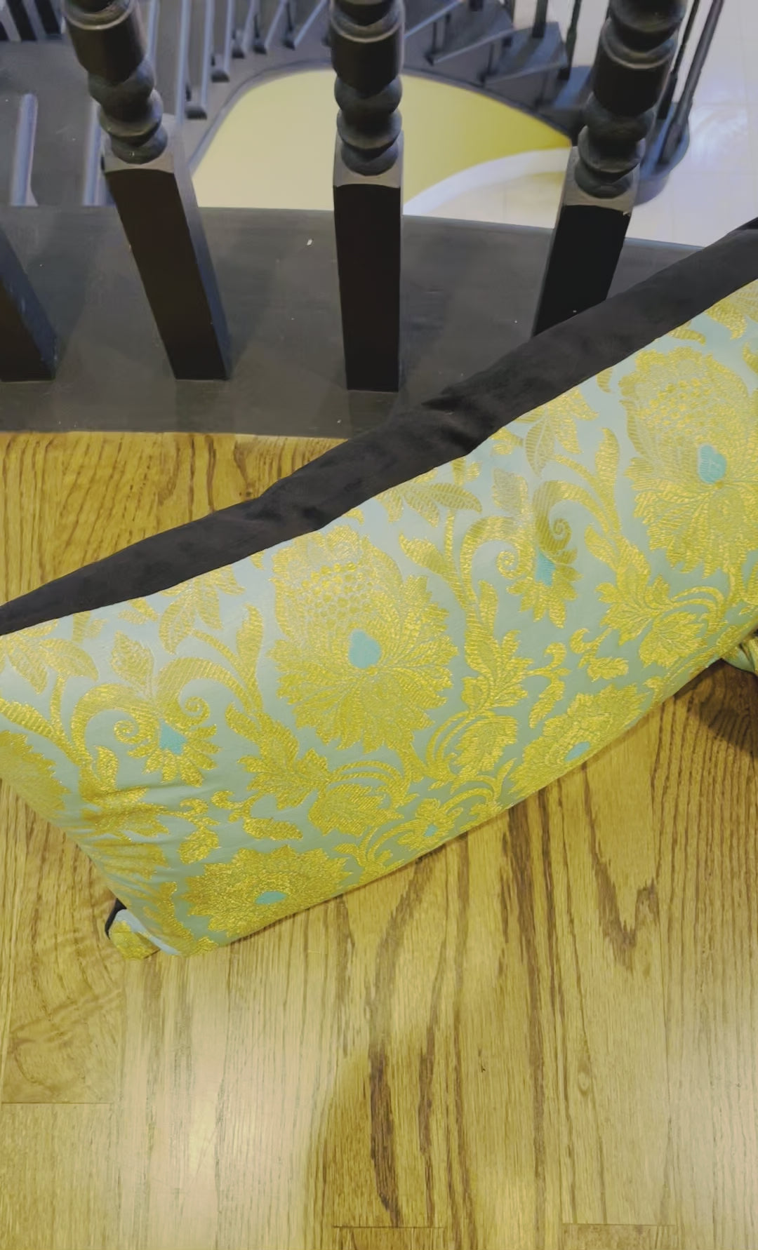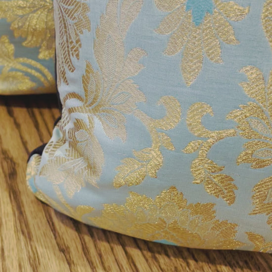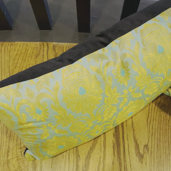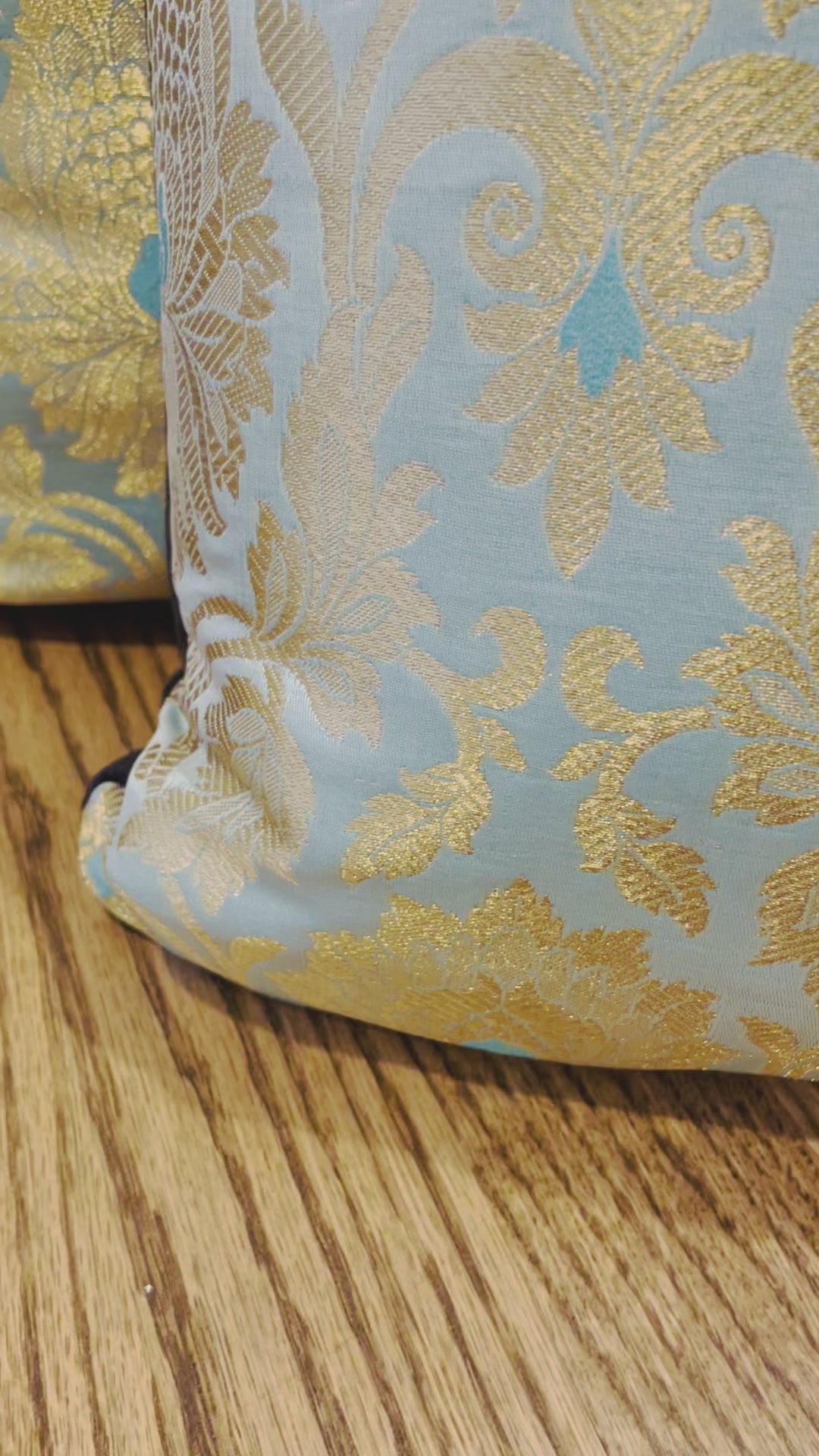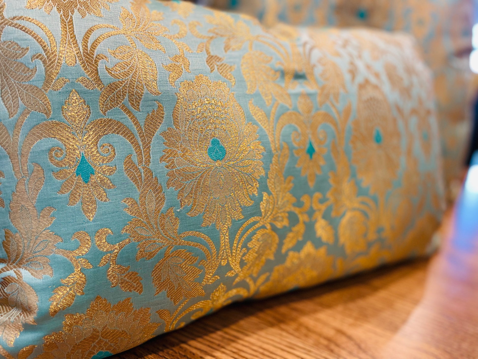 Gorgeous Emerald Green Silk Cushions with a flower design Handwoven in golden threads all over the front. With a soft black velvet back and a hidden zippered closure, these cushions are easy to use and definitely add that Oomph to any space!