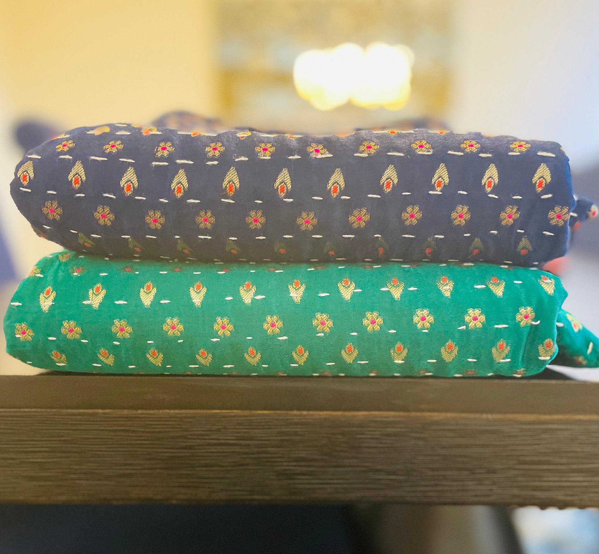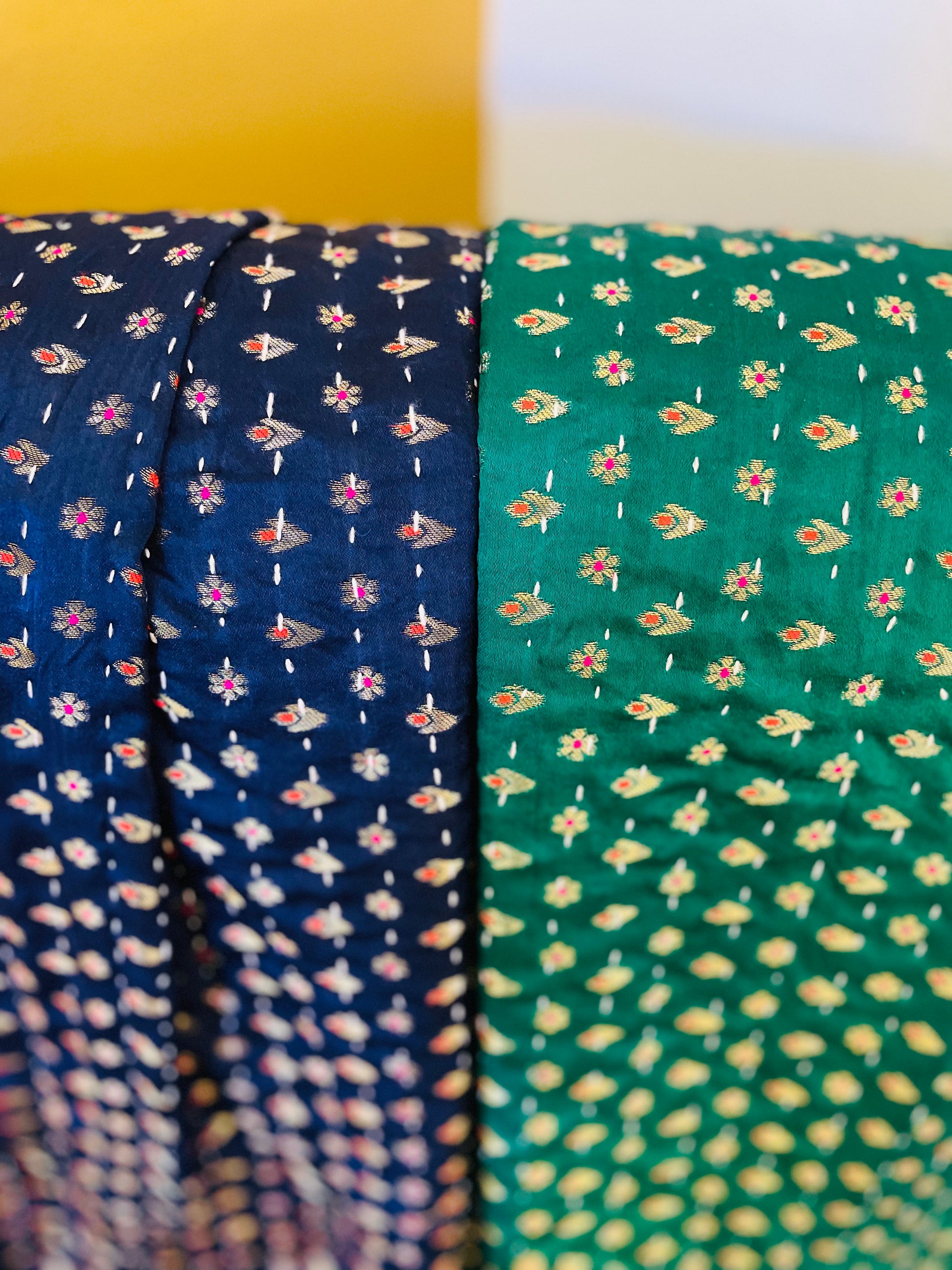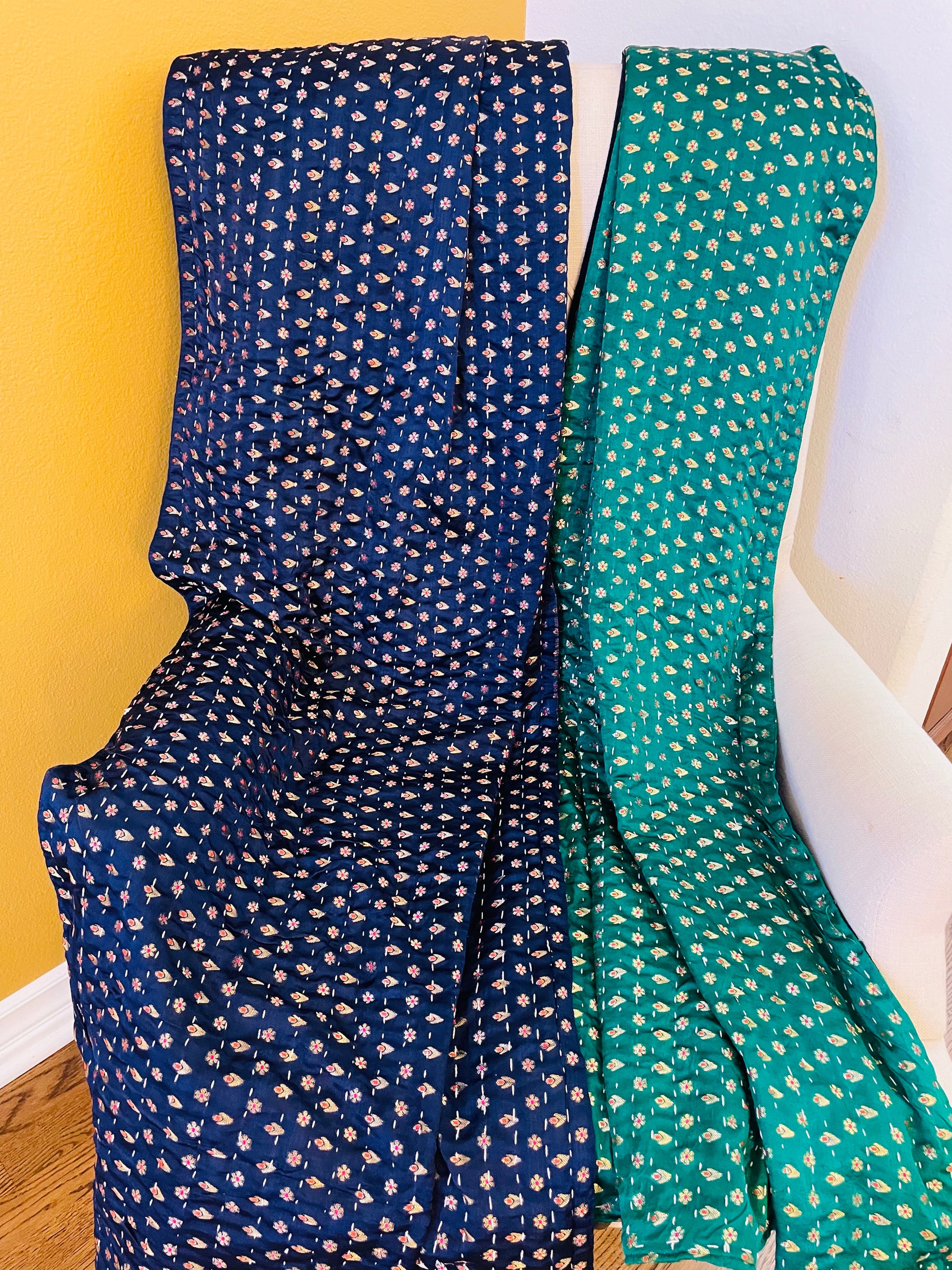 These are our softest throws available! These Gorgeous hues of Blue and Green with small Flowers and Stars woven into them with golden Zari threads, are so smooth and perfect to cuddle under! They are both hand stitched using the Kantha stitch all over with a layer of black velvet under. Grab these one-of-a-kind pieces today!