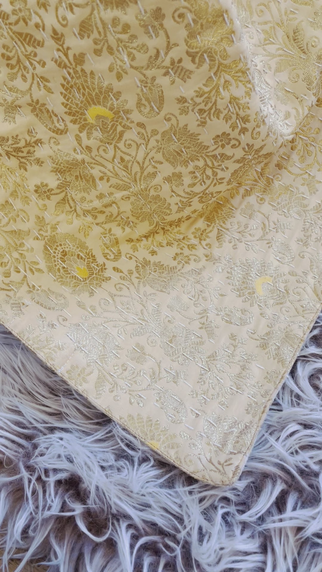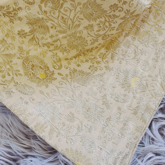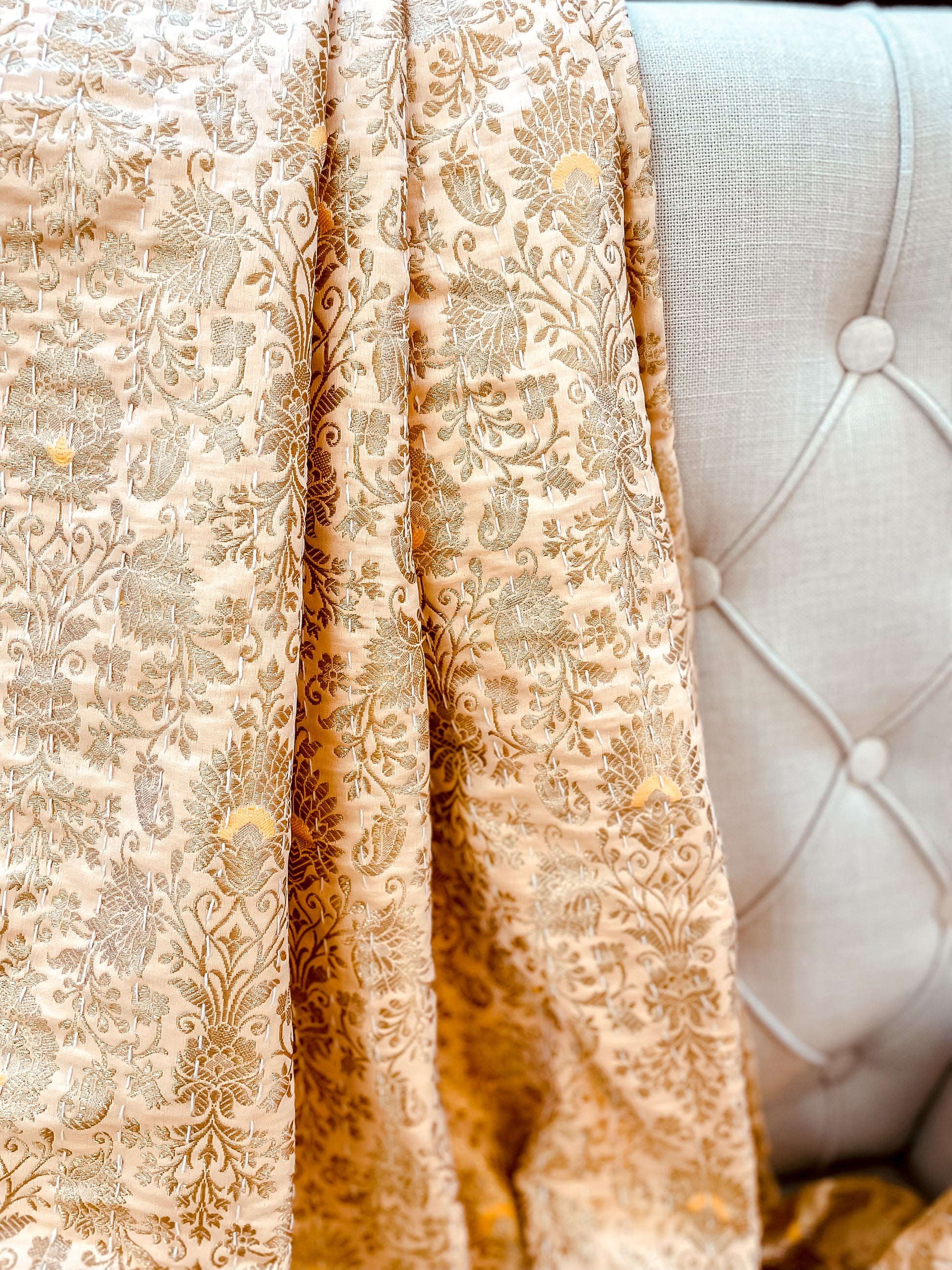 Gorgeous Peach Silk Throw with a flower design Handwoven in golden threads. The Throw is hand stitched using the Kantha stitch all over with a layer of soft cream colored velvet under. This Throw is sure to elevate and make your space look royal! Great as a housewarming gift as well!