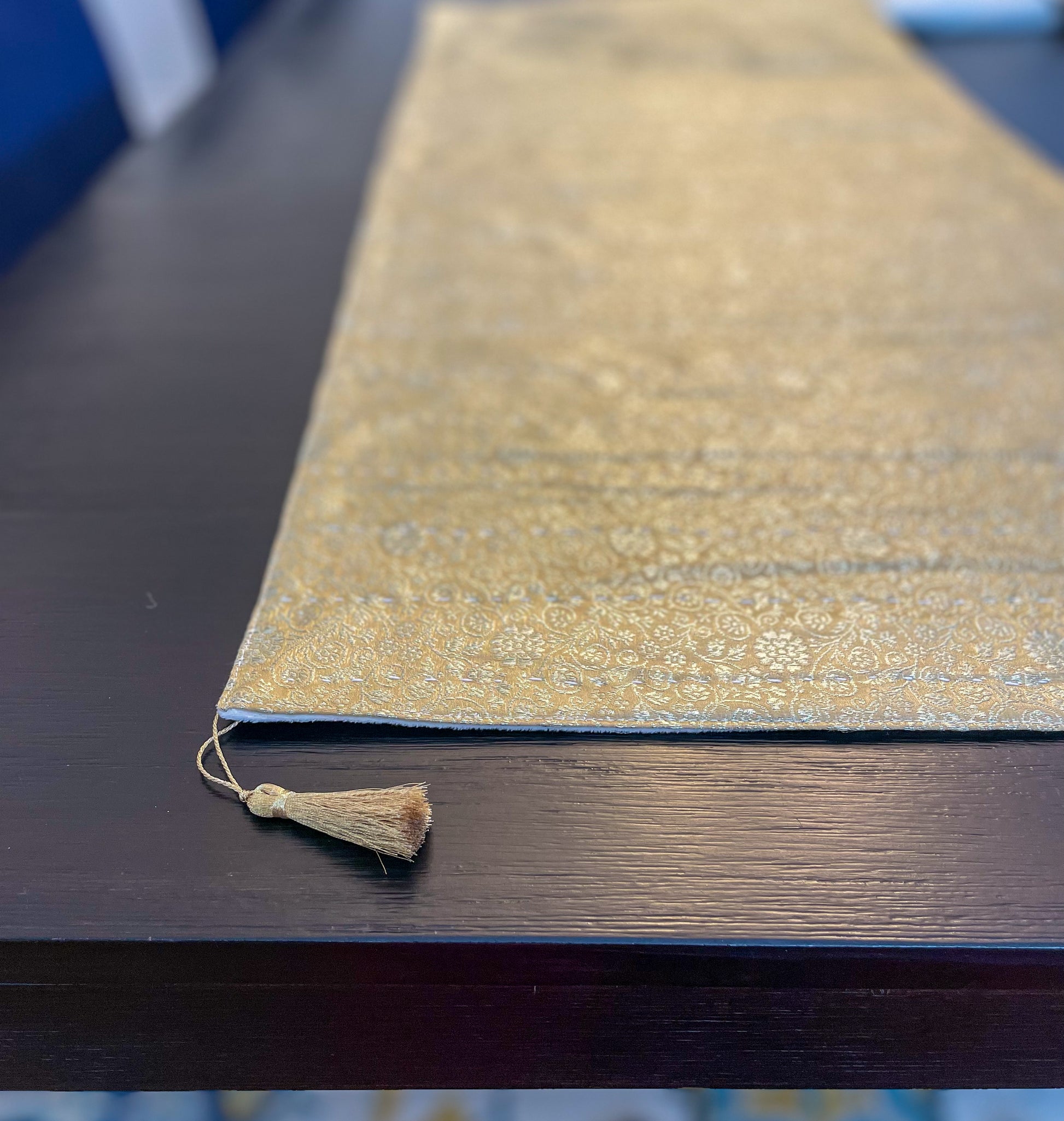 Elevate your dining table with this Golden Silk Saree runner with a layer of soft, beige velvet under. The runner is Hand-stitched with the Kantha stitch all over, making it as Unique as can be! Each corner of the runner is embellished with a golden tassel.