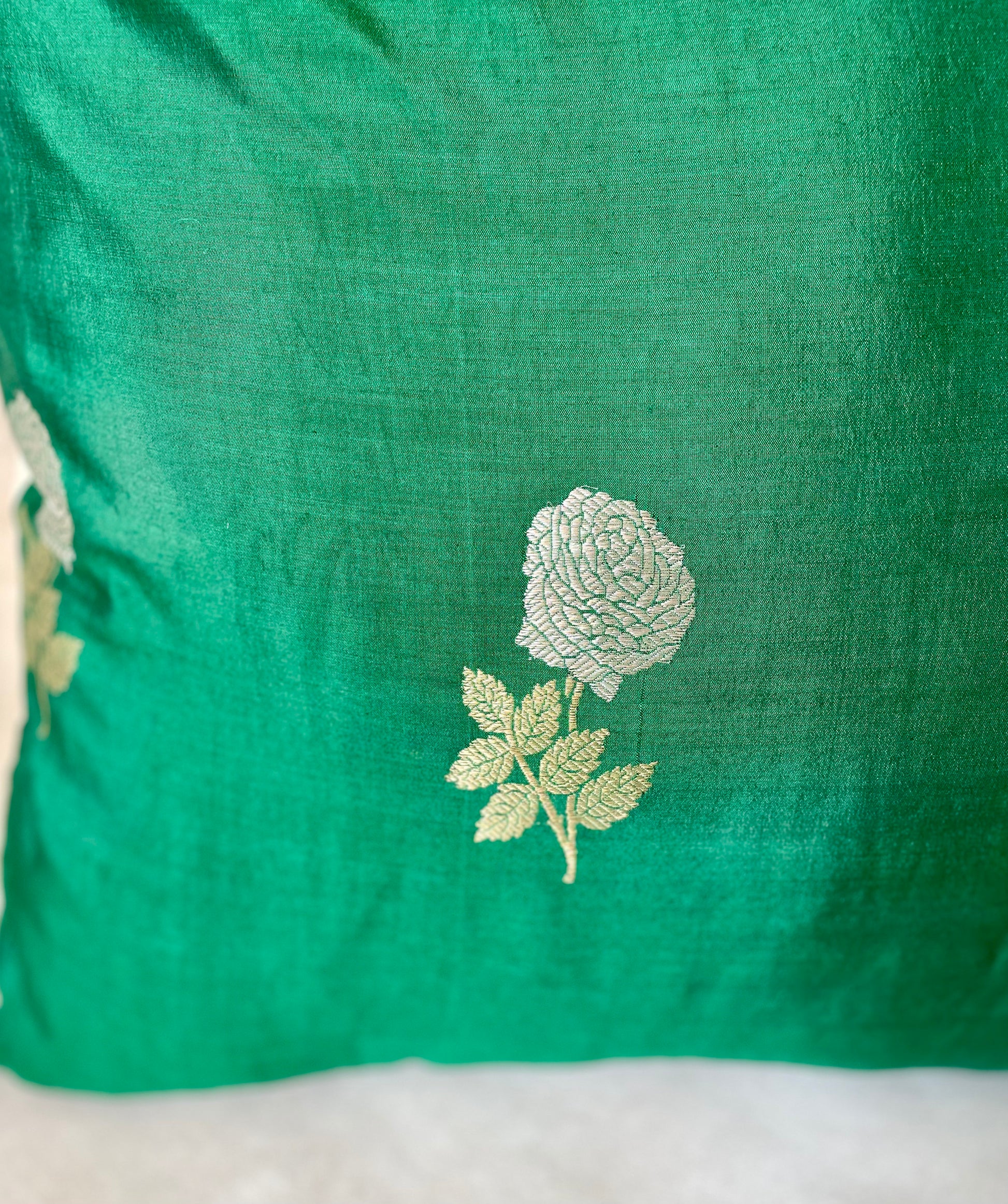 Each cushion in our Gulaab Collection is created from hand-woven silk Sarees, adorned with soft gold and silver rose motifs. The result is a blend of heritage textiles and modern design - subtle, timeless and full of soul. The cushions have a soft beige velvet back with a hidden zipper on one side.