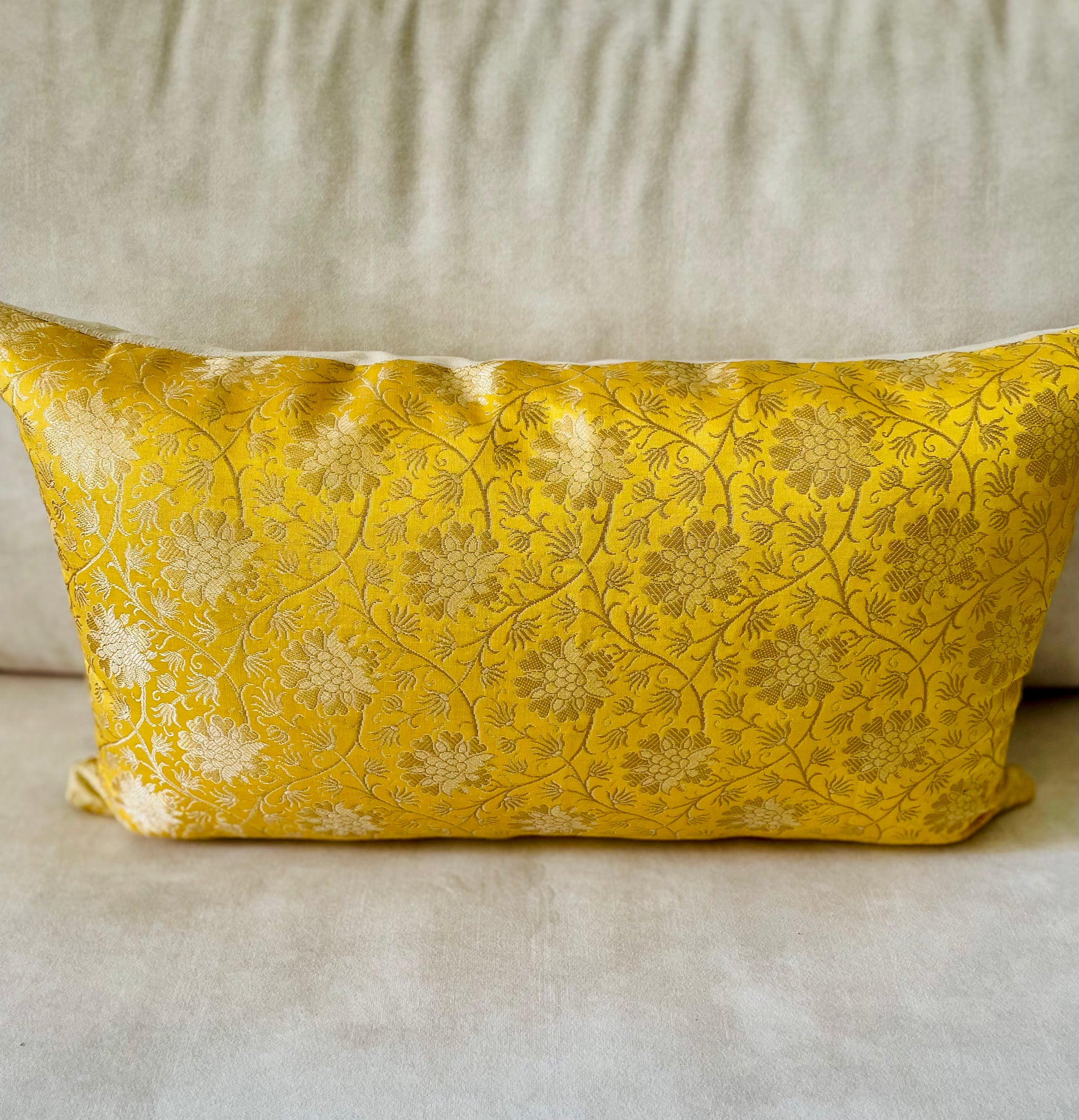 This Collection comes in 2 colors: Grey with Golden threads and Yellow with Golden threads, woven in beautiful floral designed Silk Sarees, repurposed into soft Cushions with beige velvet backings and hidden zippered closures on one end. Add these to your couch, a reading nook or even your bed! Limited pieces available.