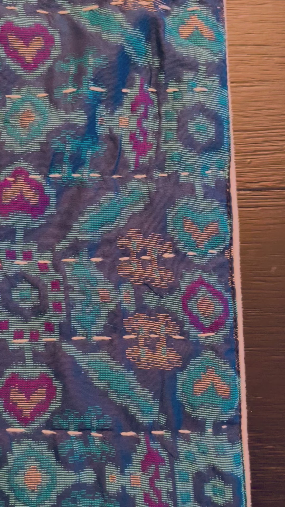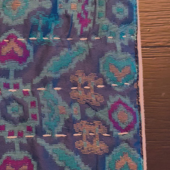 A gorgeous blue, magenta and gold Ikat designed Silk Saree repurposed into a beautiful Kantha hand-stitched Table Runner, making it as Unique as can be! A layer of soft beige velvet added under and golden tassels embellished on each corner. This runner is perfect to add that color and texture to any table!