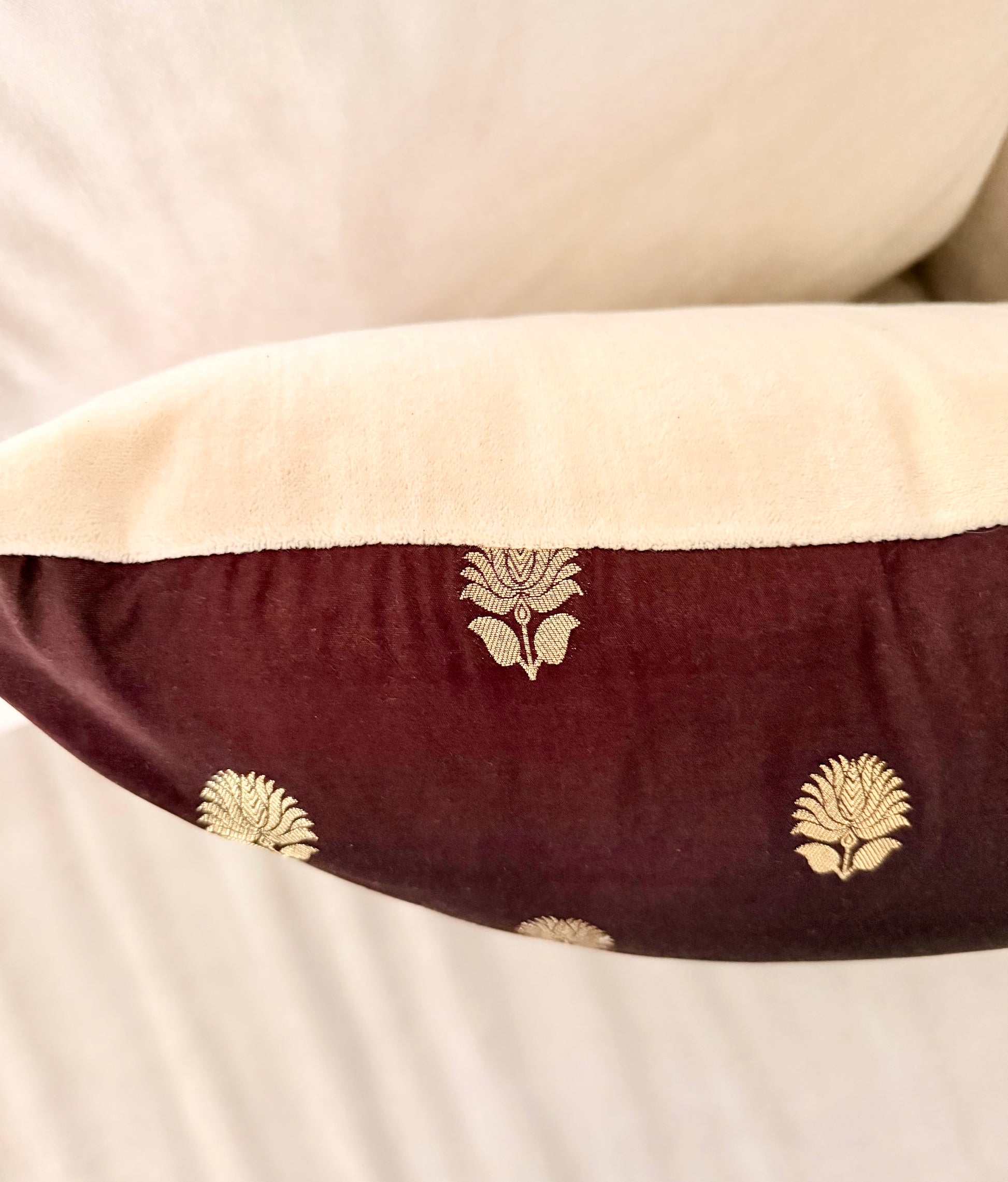 Add a touch of Heritage Charm to your home with the Kamal Collection Cushion, handcrafted from Handwoven Silk Sarees and transformed into elegant, sustainable decor. Featuring rich maroon tones with intricate gold Lotus motifs, this artisan-made cushion brings warmth, texture, and timeless luxury to any space. Perfect for sofas, accent chairs, or bedroom styling, it’s an heirloom-quality cushion designed to elevate modern living with meaning and craftsmanship.