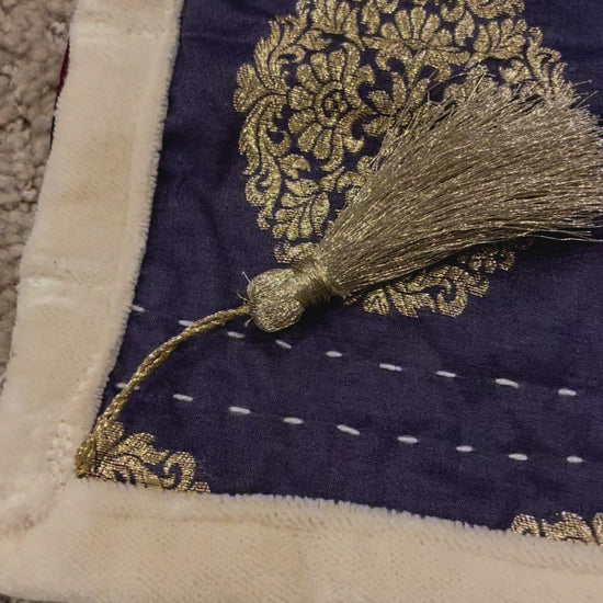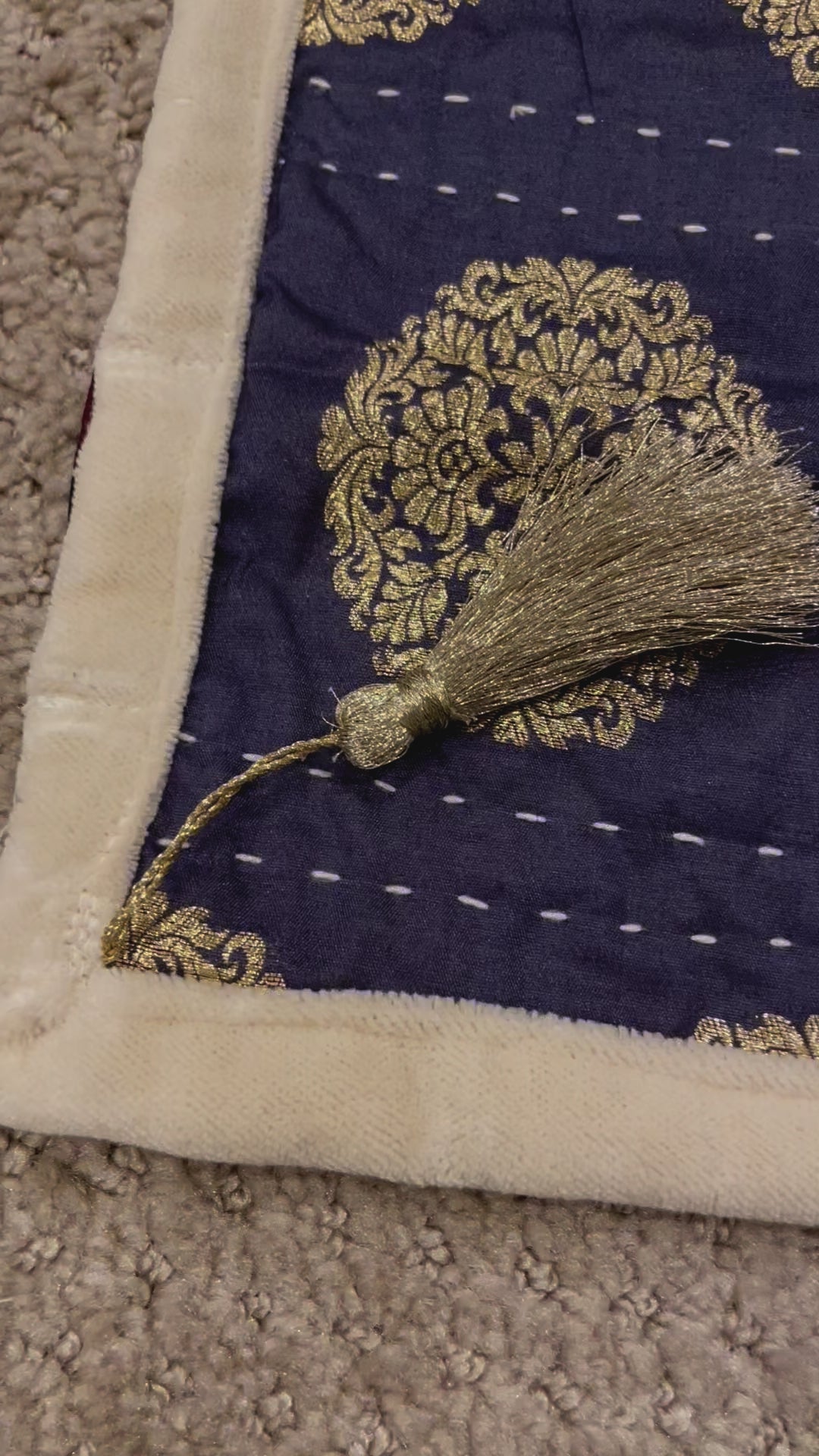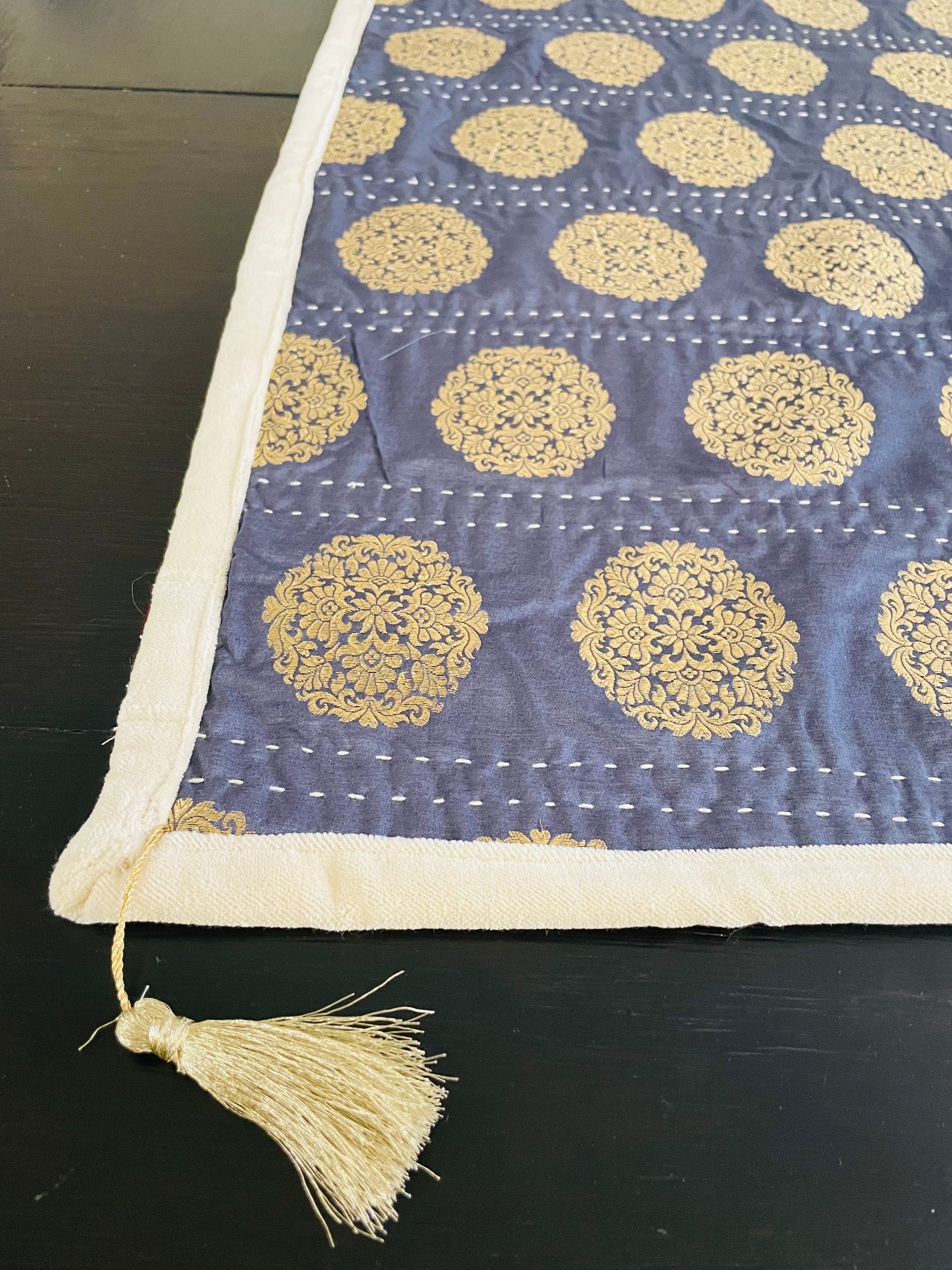 With a steel grey background, Gold Zari threads are Hand-woven into a flower medallion motif Silk Saree that is then repurposed into Table Runners. These table runners, with a layer of beige velvet under are Hand-stitched using the Kantha technique by local women artisans. Every corner adorns a golden tassel. Elevate you dining experience or add them on top of a Hutch! Limited pieces available.