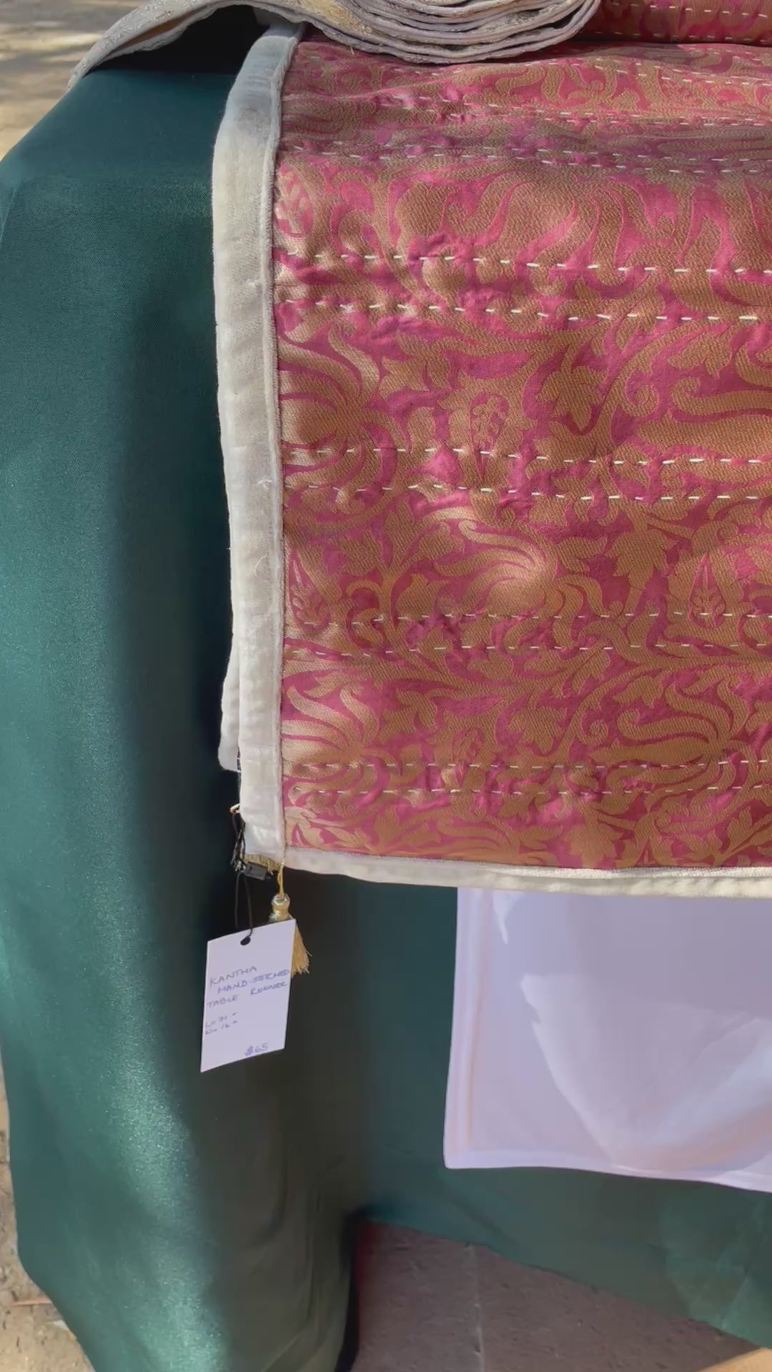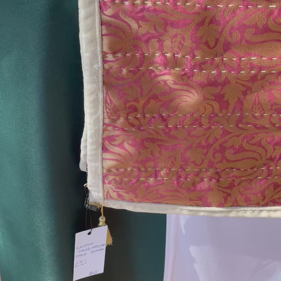 Elevate your dining experience with the Sultana Table Runner! Crafted from richly hand-woven Banarasi silk Saree, this piece features ornate gold detailing set on a deep rose pink background, hand-stitched meticulously with the Kantha technique by women artisans