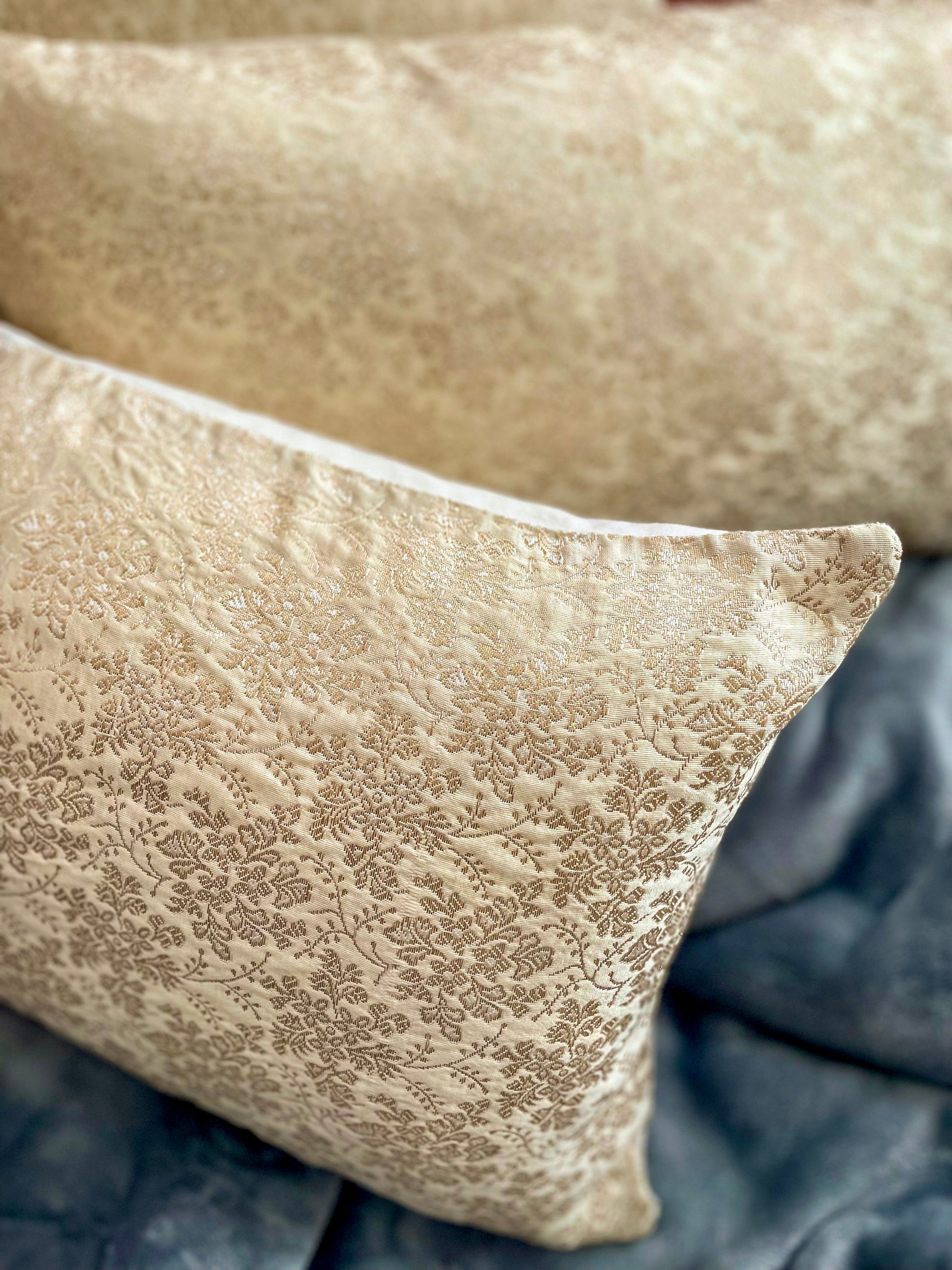 A beautiful design of flower and leaf motifs in golden Zari threads woven on a Silk Saree, making each Cushion a unique piece! The backs are a soft beige velvet with a hidden zippered closure on one end.